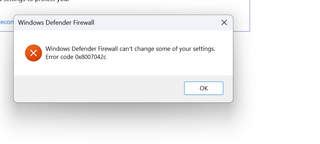 In this state, all ports will remain filtered for inbound connections and the firewall itself cannot be configured. The error below occurred when attempting to reenable the firewall through the Settings menu.
