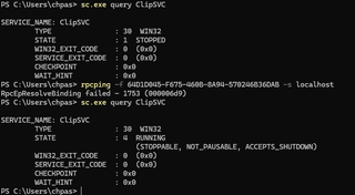 This service is currently stopped, demand start, and should start when the endpoint mapper is asked about interface 64D1D045-F675-460B-8A94-570246B36DAB. We can try to start this service using rpcping.