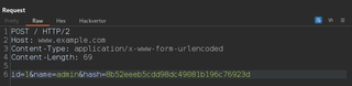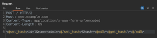 To calculate the hash, we set a Hackvertor variable around what we want to hash (i.e., the first two (2) body parameters). In the "hash" parameter, we get the value of our variable and surround that with an MD5 Hackvertor tag.
