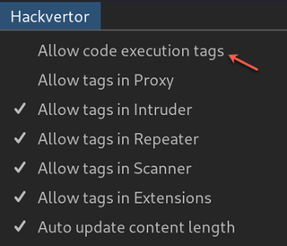 The file menu for Hackvertor also has an option to "Allow code execution tags".