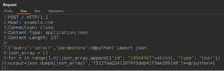 Python relies on spacing, and we can match the indentation in a Hackvertor tag with a new line. Now if we look at the request sent in the logger tab, we can see it created a JSON list of possible user IDs.