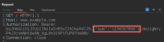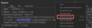 With the token body now decoded and surrounded by a Hackvertor tag, we can now brute force a section of the token’s body. To do this, we select a section of the token we want to brute force and send the request to Intruder.